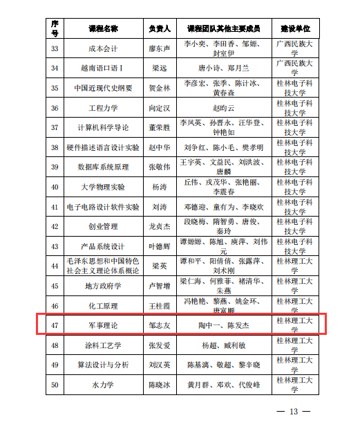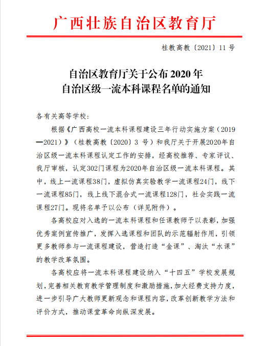 近日,自治区教育厅发布了《自治区教育厅关于公布2020年自治区级一流本科课程名单的通知》(桂教高教〔2021〕11号),太阳集团2138的《军事理论》课程获批为广西一流本科课程(线上与线下混合式一流课程)。