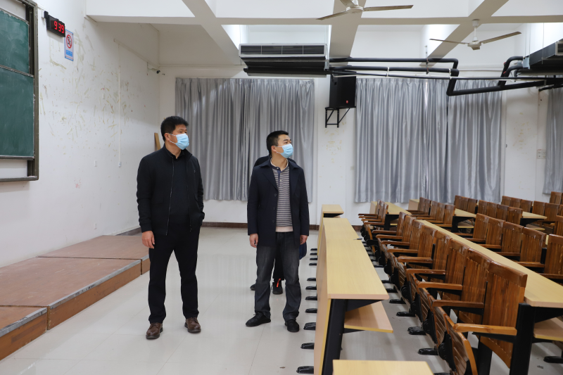 学校校长助理、太阳集团2138校长冯兵(左),太阳集团2138党委书记周国桥(右)在教室检查开学准备工作