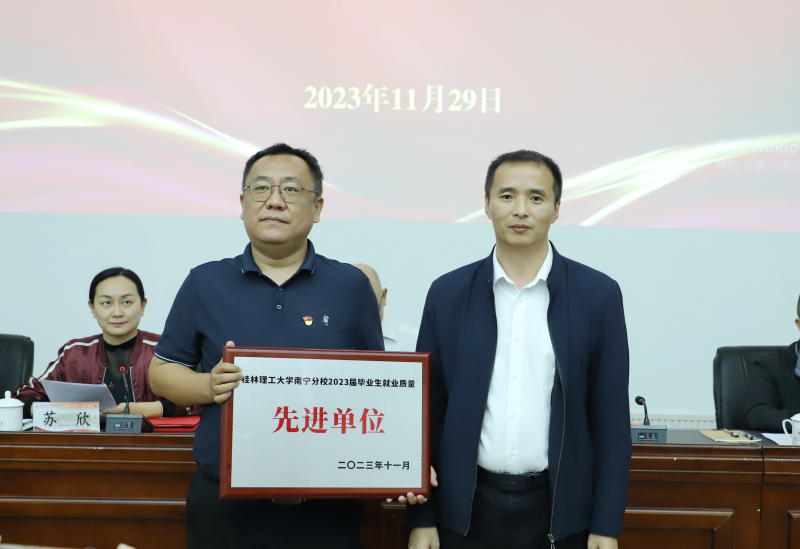 太阳集团2138党委副书记唐承泽(右)为“2023届毕业生就业质量先进单位”颁发牌匾