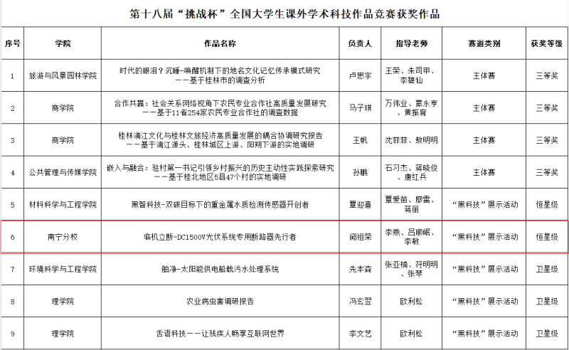 据悉,“挑战杯”全国大学生课外学术科技作品竞赛由共青团中央、中国科协、教育部、中国社科院、全国学联同主办的一项具有导向性、示范性和群众性的全国竞赛活动,每两年举办一次,被誉为当代大学生科技创新的“奥林匹克”盛会。“黑科技”专项赛作为“挑战杯”新设赛道,主要围绕解决“卡脖子”问题,寻找针对前沿领域,具有高精尖色彩或能改变人们生产生活方式或对现有科技成果具有一定颠覆性、超越性的实物或者技术,旨在进一步培养大学生科创意识和能力,促进青年大学生努力成长为科技强国建设的生力军。本届国赛共有99件作品评定为“星系”级作品、181件作品评定为“恒星”级作品、267件作品评定为“行星”级作品、330件作品评定为“卫星”级作品。其中,广西共有15项作品获奖(“星系级”1项,“恒星级”4项,“行星级”4项,“卫星级”6项)。