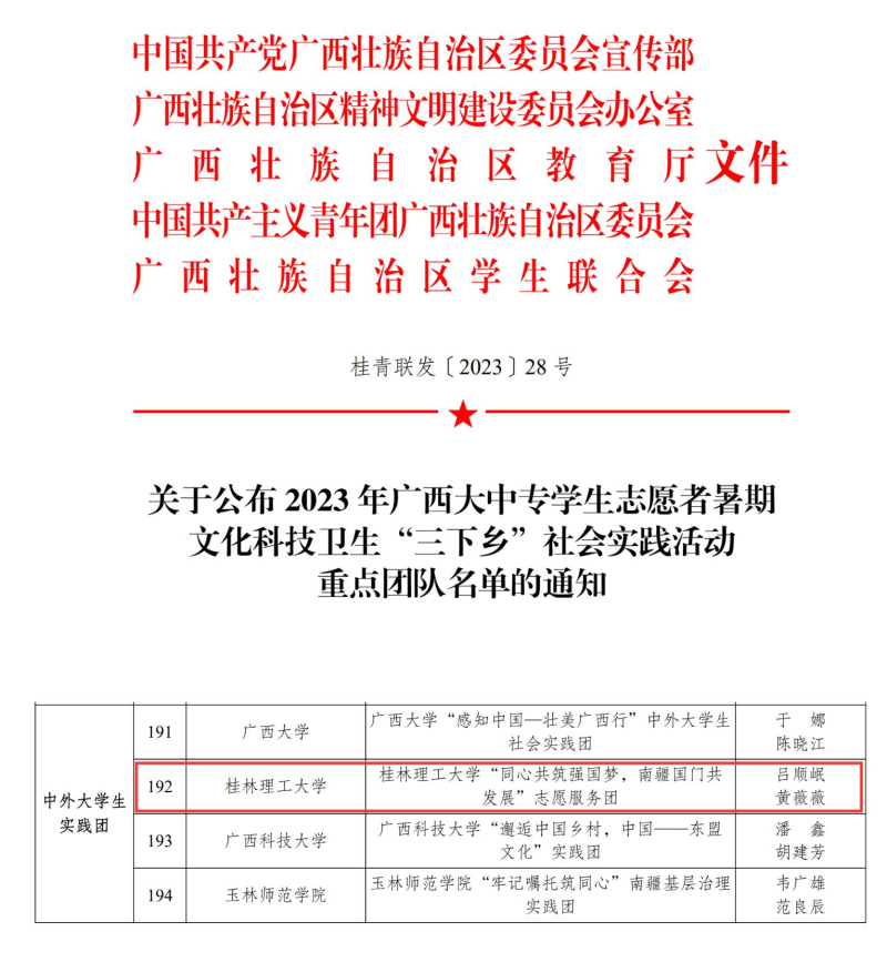 近日,根据自治区党委宣传部、自治区文明办、自治区教育厅、共青团广西区委和广西学联下发的《关于公布2023年广西大中专学生志愿者暑期文化科技卫生“三下乡”社会实践活动重点团队名单的通知》(桂青联发〔2023〕28号),机械与控制工程系“同心共筑强国梦,南疆国门共发展”志愿服务团队获评“三下乡”社会实践活动重点团队。