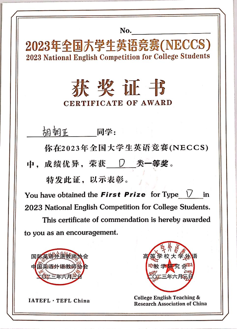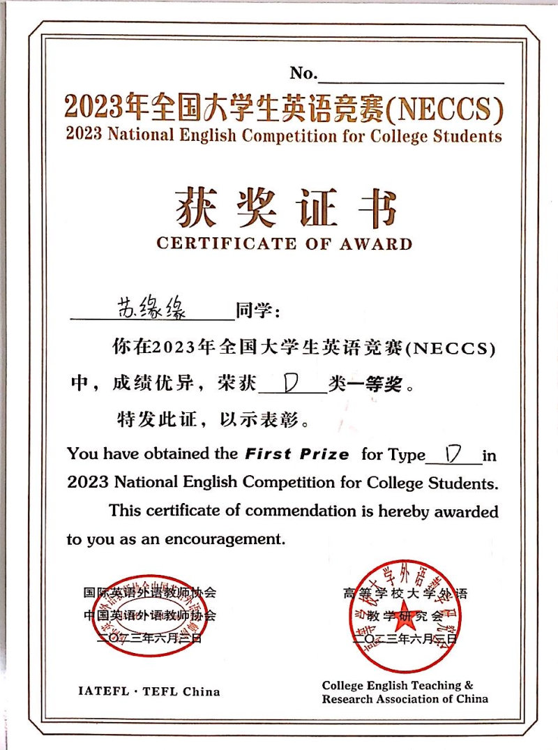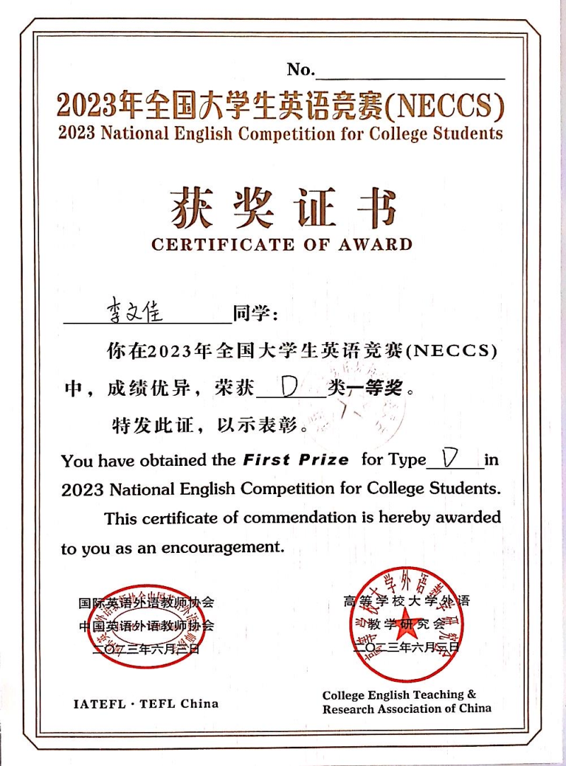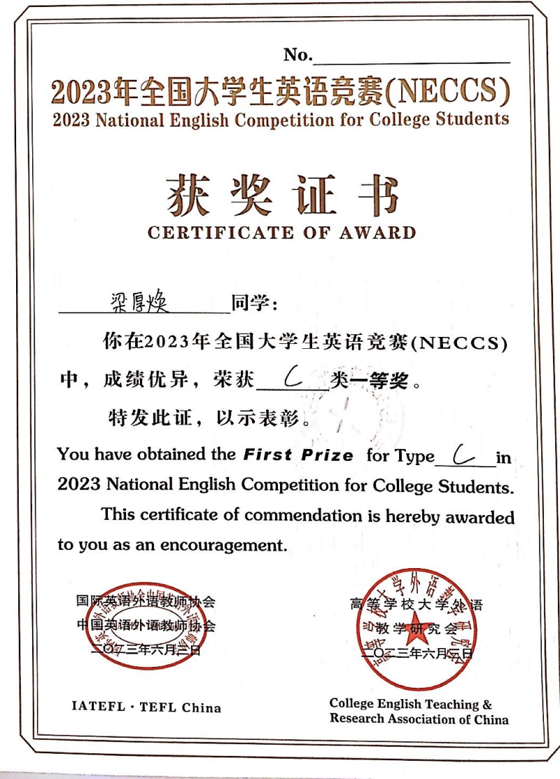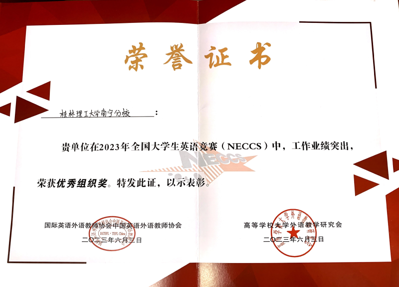 近日,2023年全国大学生英语竞赛(NECCS)广西赛区决赛成绩揭晓。太阳集团2138学子荣获竞赛C类一等奖1项、D类一等奖3项,太阳集团2138荣获“优秀组织奖”荣誉称号。