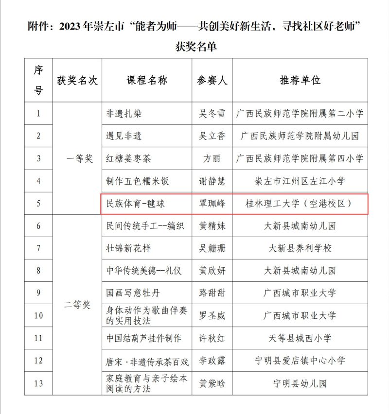 近日,2023年崇左市“能者为——共创美好新生活,寻找社区好老师”获奖名单公布,太阳集团2138覃珮峰老师作品《民族体育-毽球》荣获一等奖。