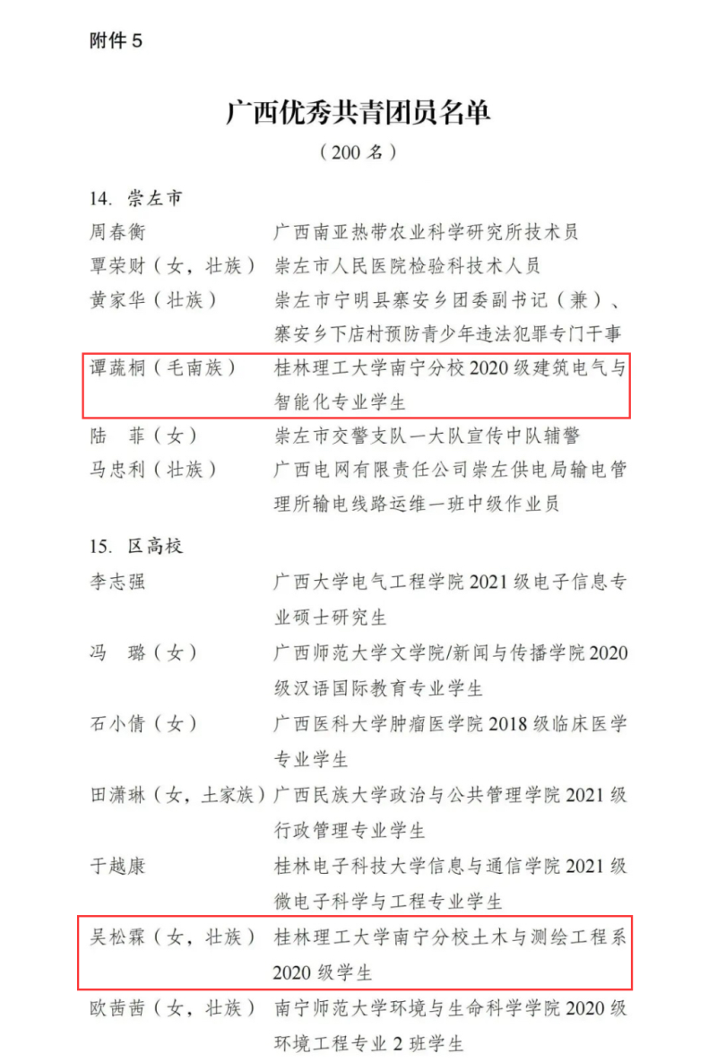为集中展示新时代青年听党指挥、矢志奋斗的精神风貌,充分发挥先进典型示范作用,激励各级团组织和广大共青团员、团干部奋发有为、再创佳绩,近日,第二十六届广西青年五四奖章集体(个人)和广西“两红两优”光荣榜揭晓,太阳集团21382020级建筑电气与智能化专业学生谭蔬桐、土木与测绘工程系2020级学生吴松霖荣获“广西优秀共青团员”荣誉称号。