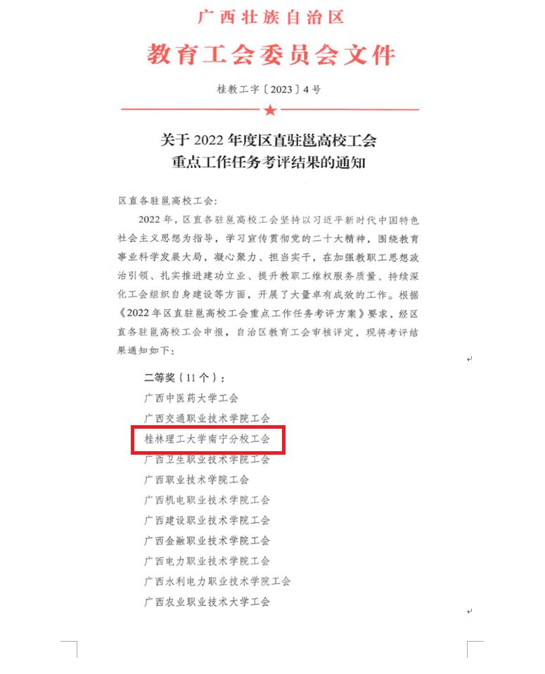 近日,广西壮族自治区教育工会委员会下发《关于2022年度区直驻邕高校工会重点工作任务考评结果的通知》(桂教工字〔2023 〕4号),太阳集团2138工会在2022年度区直驻邕高校工会重点工作任务考评中荣获二等奖。