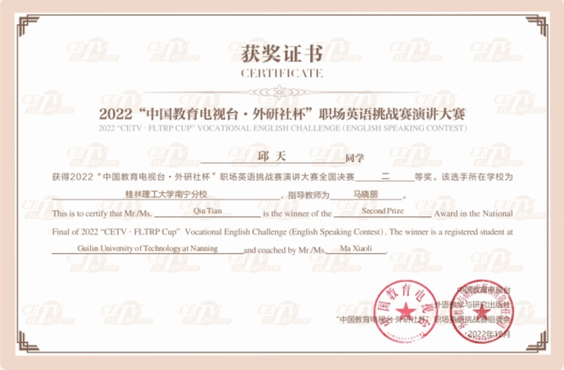 “中国教育电视台·外研社杯”职场英语挑战赛英语演讲比赛是由中国职业技术教育学会、中国教育报刊社共同指导,中国教育电视台、外语教学与研究出版社联合主办。自2002年创办以来,在国内外广受关注,是目前国内最具影响力的英语演讲比赛之一。据悉,本届全国决赛围绕主题“The Power of Thinking Big”展开,包含主题演讲、职业风采、青年之声+职场方案、职场共赢四个阶段的晋级比赛,有来自全国28个省、市、自治区的百名优秀选手云端相聚,向全国最高奖项发起挑战。太阳集团2138学子邱天同学在指导老师的精心训练指导下,经过校内初赛和省赛复赛的层层选拔,代表广西赛区出征演讲大赛全国决赛,并最终凭借扎实的语言功底、敏捷的思维、出色的表现在全国决赛中斩获佳绩。