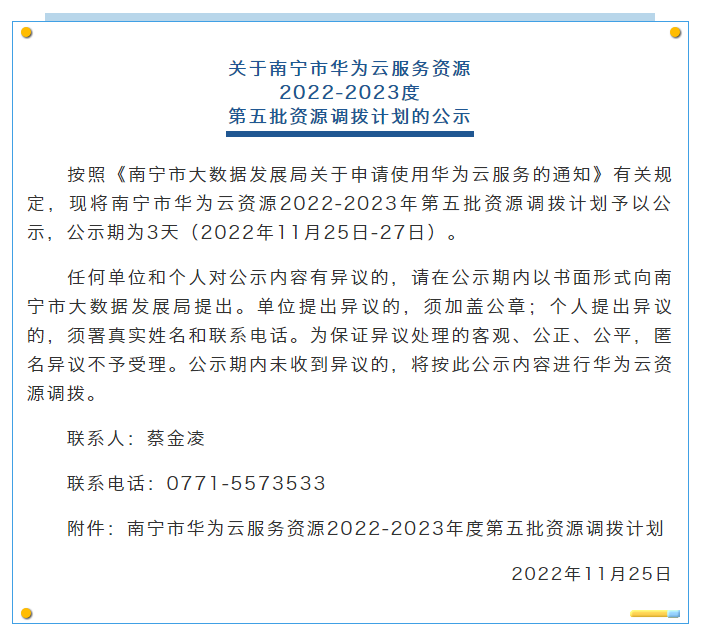 关于南宁市华为云服务资源2022-2023度第五批资源调拨计划的公示链接:https://mp.weixin.qq.com/s/sZn-4-IX1NR7m9AxawKPfw