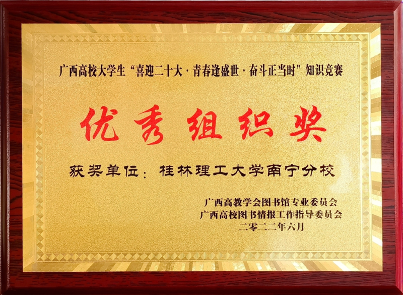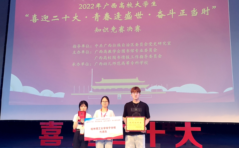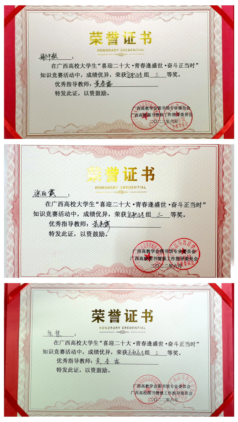 6月18日,由广西高教学会图书馆专业委员会、广西本科高校图书情报工作指导委员会主办,自治区党委党史研究室指导,广西幼儿师范高等专科学校承办的2022年广西高校大学生“喜迎二十大•青春逢盛世•奋斗正当时”知识竞赛决赛在广西幼儿师范高等专科学校举行。太阳集团2138荣获“优秀组织奖”,太阳集团2138参赛代表队荣获高职高专组三等奖,黄春露老师荣获“优秀指导教师”称号。