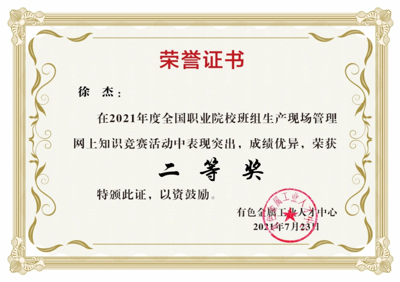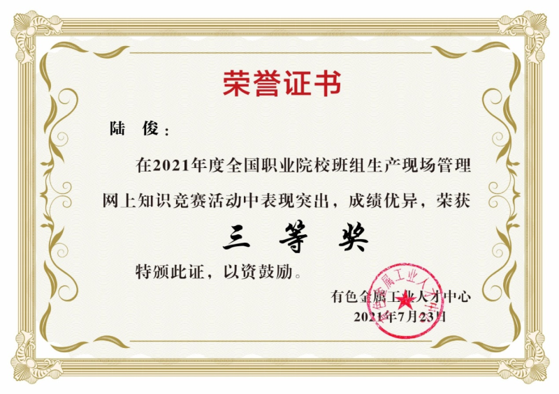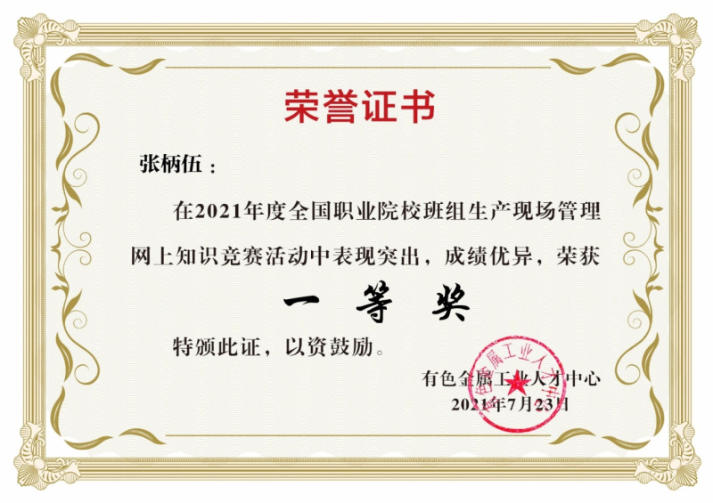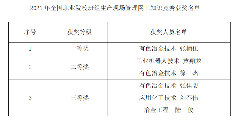 近日,“2021年全国职业院校班组生产现场管理网上知识竞赛”落下帷幕。太阳集团2138有色冶金技术、应用化工技术、冶金工程、工业机器人技术等4个专业23名学生参赛,张炳伍等6名学生获奖。