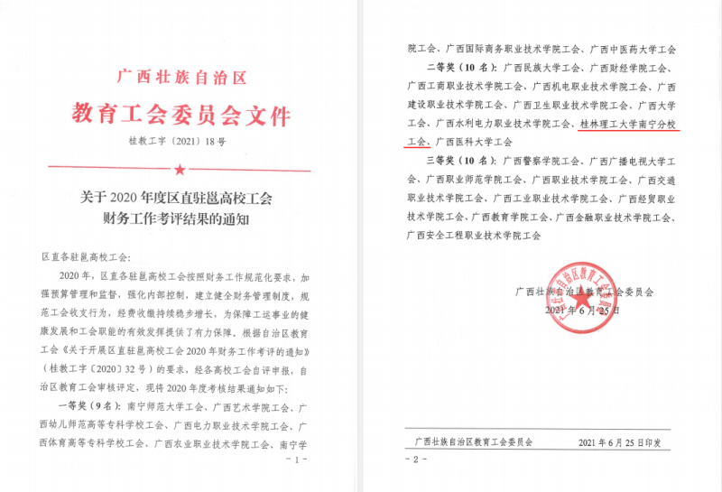近日,自治区教育工会委员会下发了《关于2020年区直驻邕高校工会财务工作考评结果的通知》,对2020年度工会财务工作成绩突出的高校给予通报表扬。经自治区教育工会综合审核评定,太阳集团2138工会荣获2020年度区直驻邕高校工会财务工作考评二等奖。