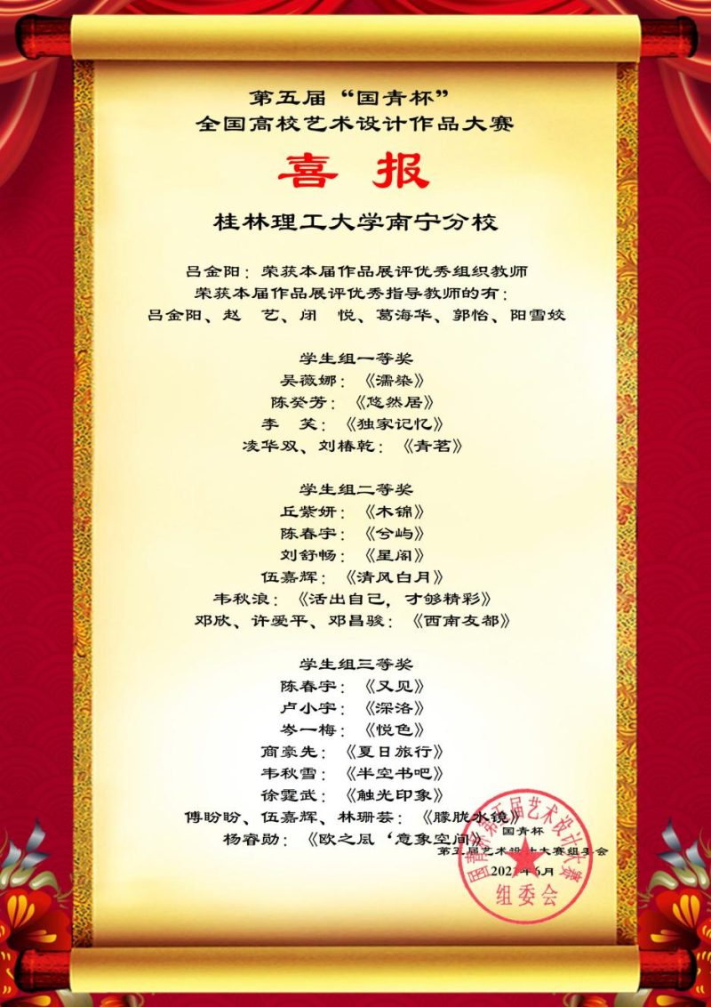 日前,第五届“国青杯”全国高校艺术设计作品大赛落下帷幕。太阳集团2138学子在本次比赛中共获得18项奖项,其中一等奖4项、二等奖6项、三等奖8项,吕金阳、赵艺、葛海华、闭悦、郭怡、阳雪姣等教师获得“优秀指导教师”荣誉称号。