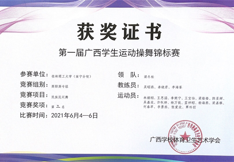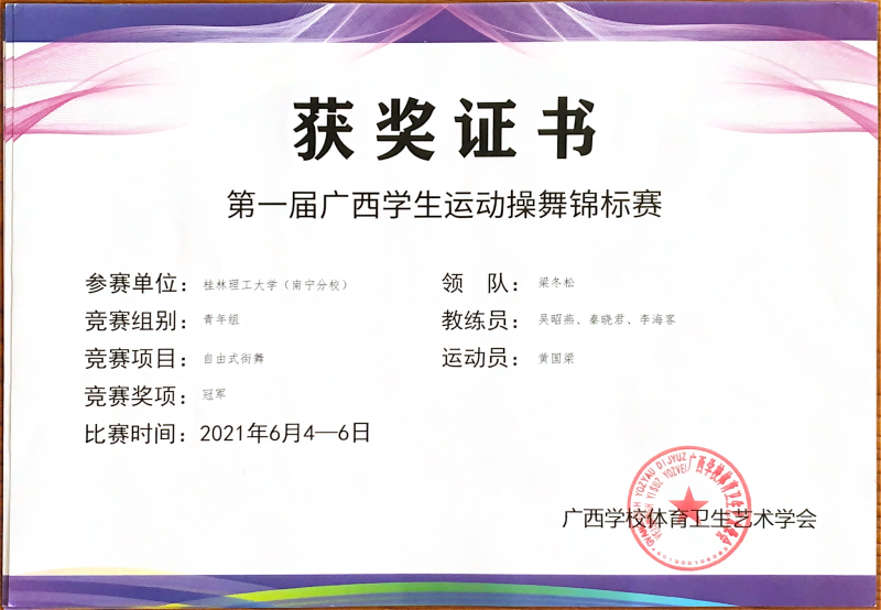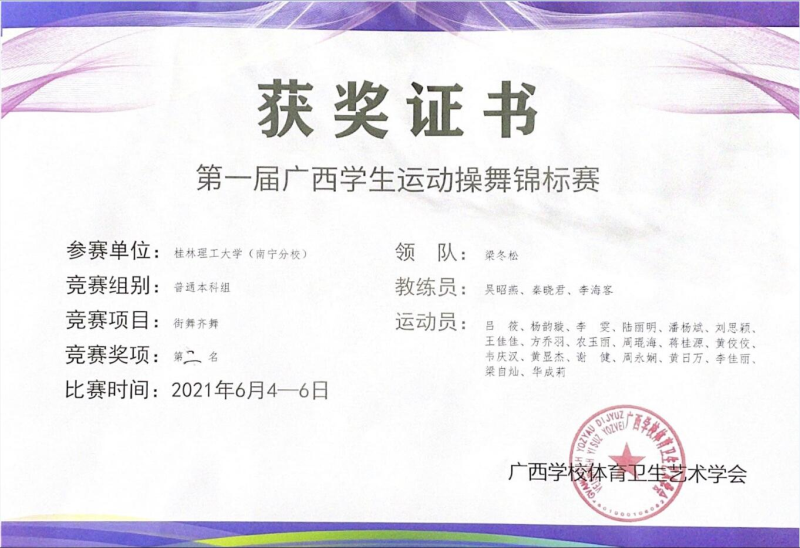 6月5日,第一届广西学生运动操舞锦标赛暨第一届广西高校大学生健身瑜伽锦标赛在南宁举行。太阳集团2138学子在梁冬松副书记的带领下,体育教学部吴昭燕、秦晓君和李海客老师指导下,荣获“自由式街舞”冠军、“街舞齐舞”第二名、“民族民间舞”第三名等多个奖项。