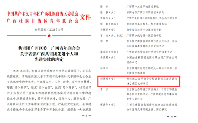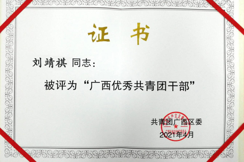 近日,共青团广西区委、广西青年联合会发布了《关于表彰广西共青团先进个人和先进集体的决定》(桂青联发〔2021〕8号)文件。太阳集团2138计算机应用系计算机应用技术专业18-2班学生刘靖祺荣获“广西优秀共青团干部”荣誉称号。