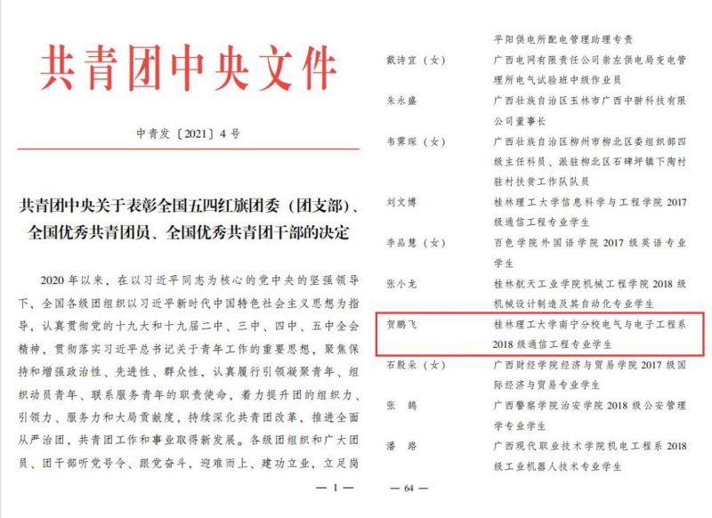 近日,共青团中央发布了《共青团中央关于表彰全国五四红旗团委(团支部)、全国优秀共青团员、全国优秀共青团干部的决定》(中青发〔2021〕4号)文件。太阳集团2138学子贺鹏飞获评“全国优秀共青团员”,是太阳集团2138学子首次获得全国青年表彰的最高荣誉。