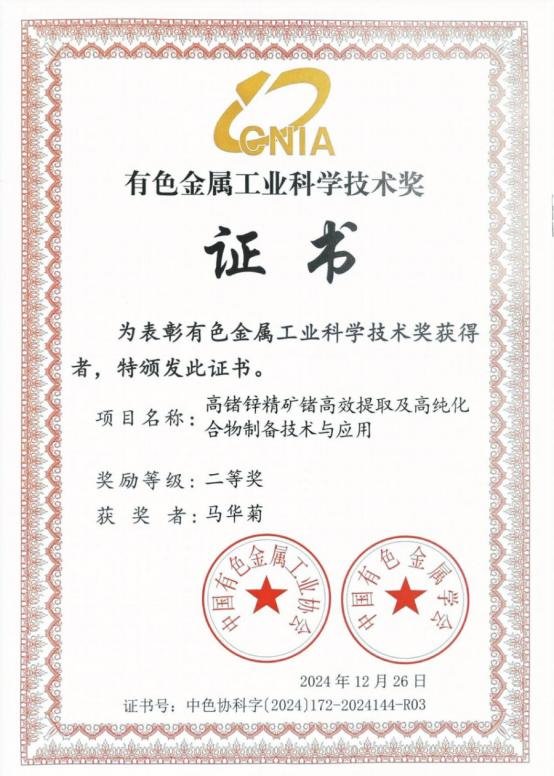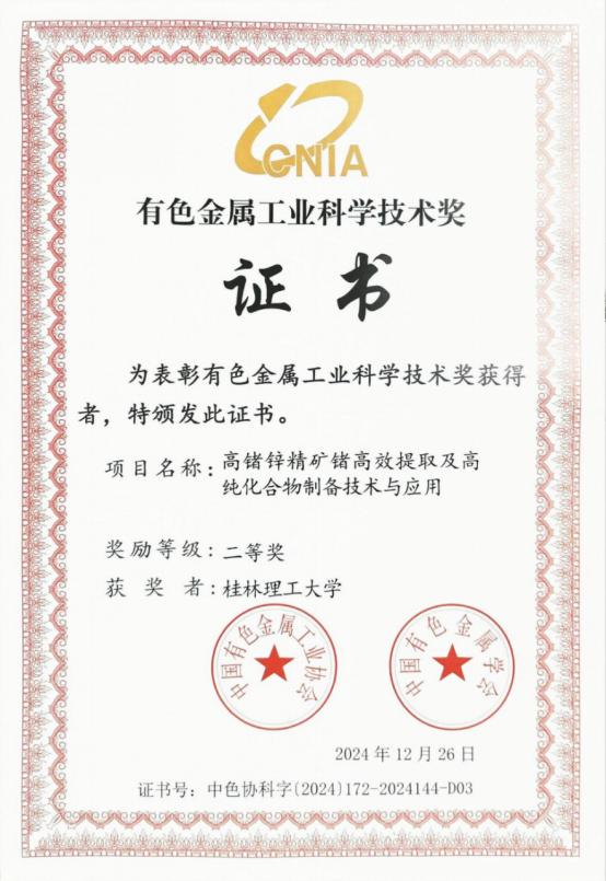 近日,中国有色金属工业协会颁布了2024年度有色金属工业科学技术奖获奖项目名单。南宁分校作为主要参与单位参与完成的项目“高锗锌精矿锗高效提取及高纯化合物制备技术与应用”荣获二等奖,太阳集团2138马华菊教授为项目主要参与人。
