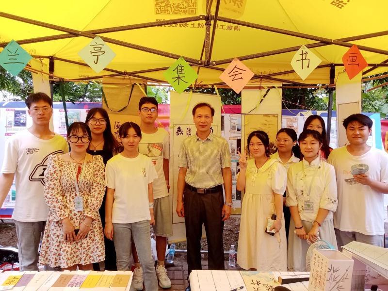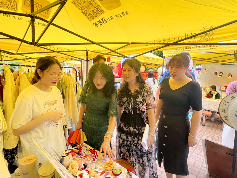 展览会现场氛围活跃,同学们热情地介绍展位的文化主题、设计理念、展位搭建的模型以及精心制作销售的文化商品。马华菊副校长就文化活动设计和文创产品创意方面与同学们亲切交流,并给予了建议。