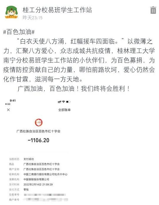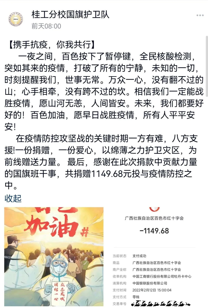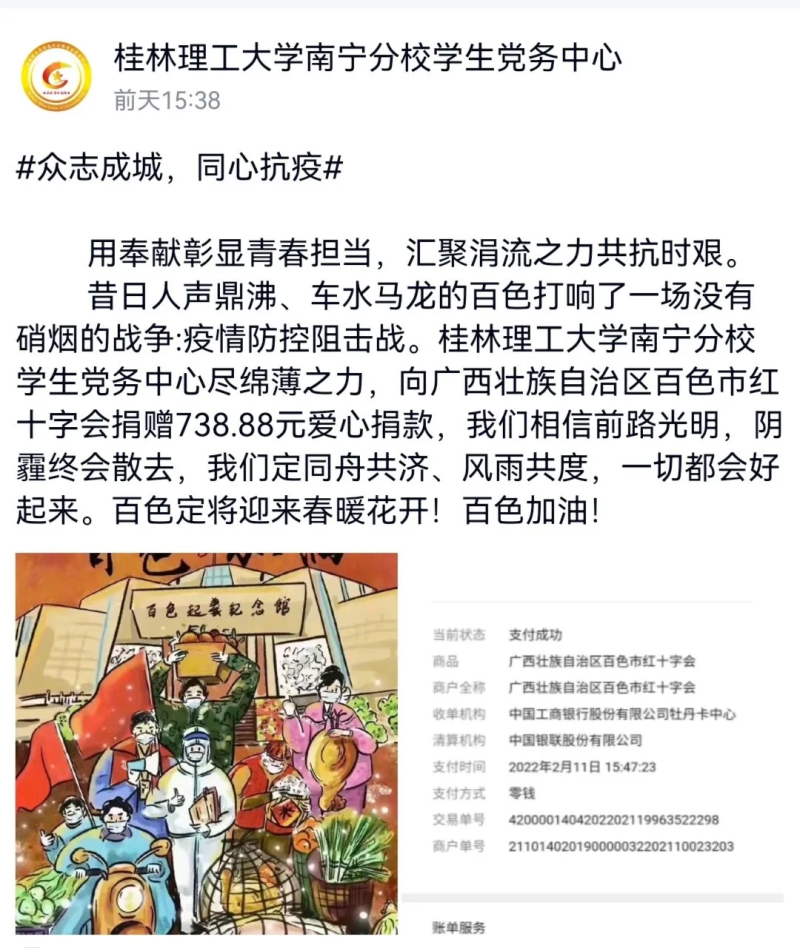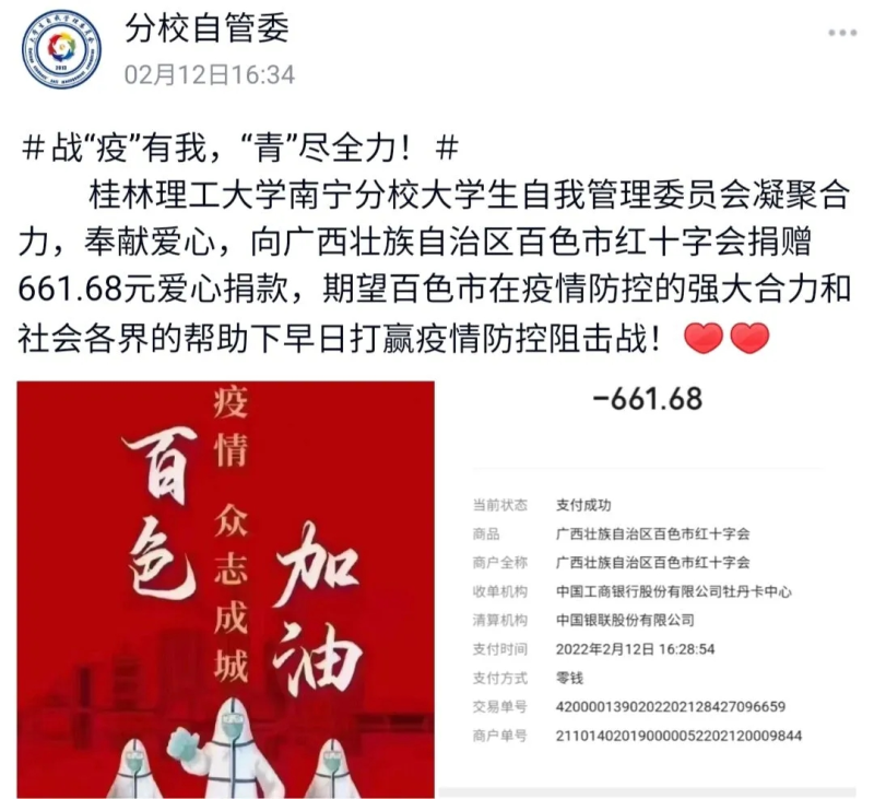 近期,广西百色市新冠肺炎疫情的蔓延牵动人心,当地疫情防控面临前所未有的压力。为助力打赢百色市新冠肺炎疫情防控阻击战,太阳集团2138各学生团体先后于2月11日、2月12日倡议广大学子自觉自愿为支持百色市新冠肺炎疫情防控工作捐款。