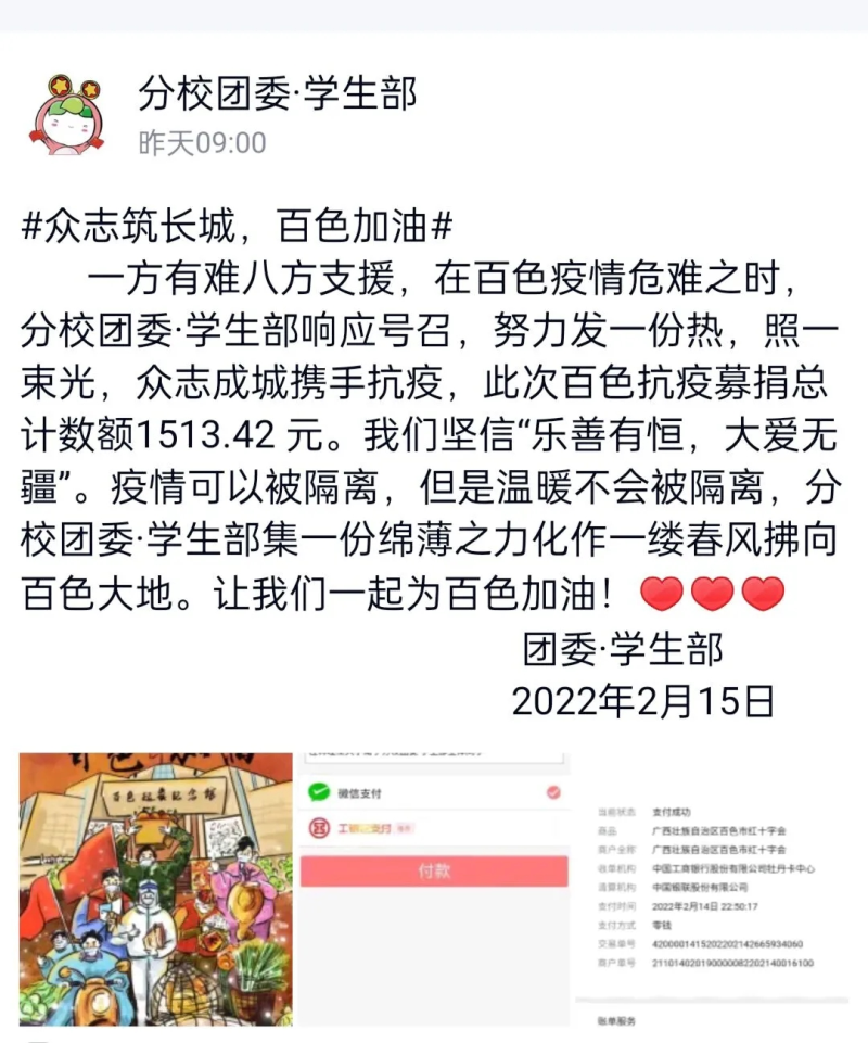 倡议发出后,太阳集团2138各学生团体积极响应号召,自觉主动组织捐款,通过电子转账、银行汇款等多渠道的方式向广西壮族自治区百色市红十字会进行捐款。截止至2月14日,捐款金额合计约一万五千余元。