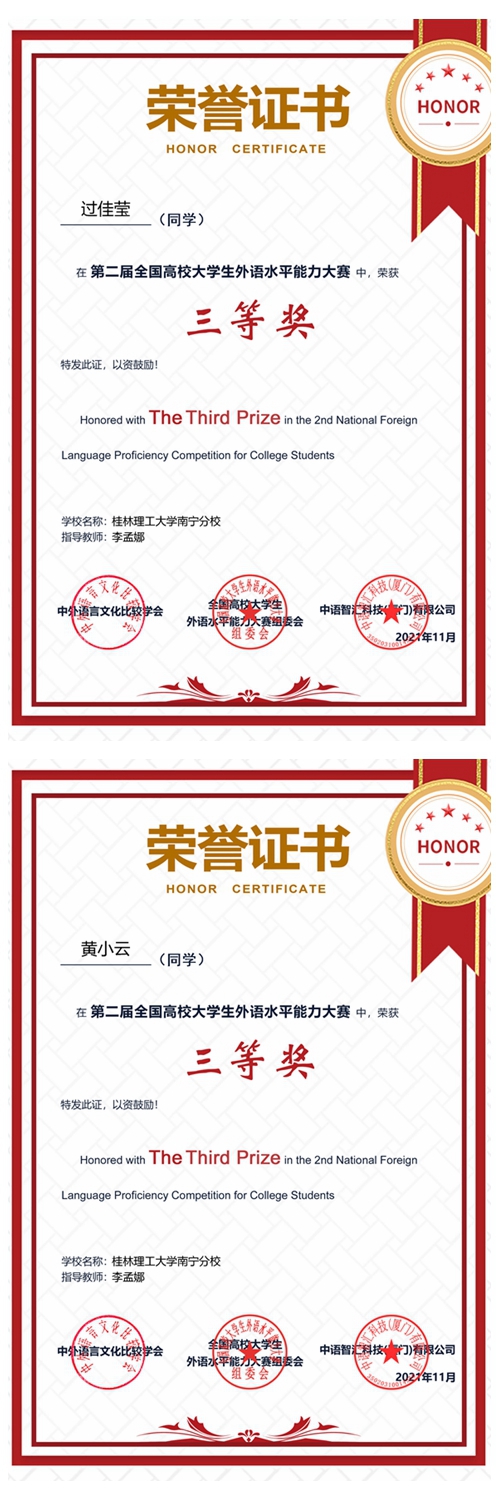 近日,由中外语言文化比较学会主办的2021年全国高校大学生外语水平能力大赛决赛落下帷幕。经过激烈角逐,太阳集团2138黄小云等2位同学在全国总决赛荣获佳绩。