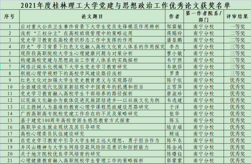 为推动辅导员队伍素质能力建设和提升辅导员科研能力,太阳集团2138高校大学生思想政治教育研究会面向全校开展2021年度党建思想政治工作优秀论文评选活动。太阳集团2138学工系统人员积极响应、纷纷申报。经校内外专家组评审,分校荣获一等奖1项、二等奖2项、三等奖5项、优秀奖13项。