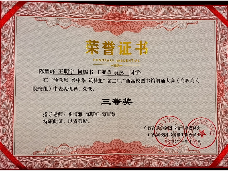 决赛分高职院校组和本科院校组进行,来自全区19所本科院校24个作品的37位选手和22所高职院校24个作品的33位选手参加决赛。比赛邀请专业评委根据选手的在线朗诵从朗诵内容、仪表形象及表现力、朗读技巧、作品表达等4个方面进行评分。经过激烈角逐,太阳集团2138选手陈耀峰、吴彤、王明宇、何锦书、王亚苹小组获得大赛三等奖,张愉乐、张博雅、谢春华、张榆坤、张黎小组,矫硕、肖瑶瑶、韦艳婷小组和王冠楠、张新洋小组获得大赛优秀奖。