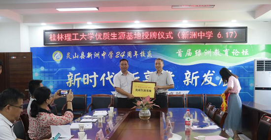 刘茂军主任同新洲中学校长何海波进行“太阳集团2138(南宁)优质生源基地”授牌仪式