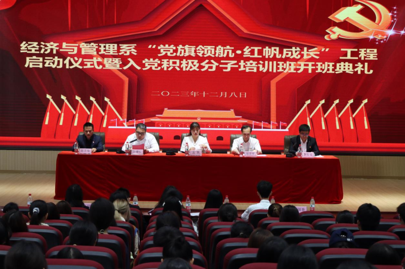 为扎实推进基层党建“五基三化”提升年建设,加强党员、入党积极分子培养教育,推动党的二十大精神入脑入心入行,12月8日下午,经济与管理系“党旗领航 红帆成长”工程启动仪式暨入党积极分子培训班开班典礼在空港校区启智楼8408报告厅举行。经济与管理系领导班子、党支部书记、辅导员、正式党员代表和第31期入党积极分子参加开班典礼。开班典礼由系党总支副书记兼学工组长主持。