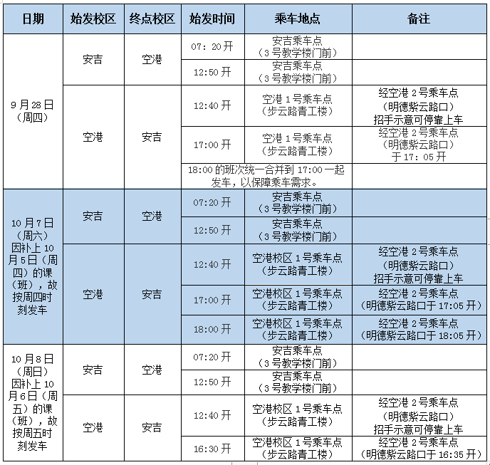 根据《关于2023年中秋节、国庆节放假安排的通知》的工作安排,为做好教职工的上班(课)的正常校区通勤保障,现将2023年中秋节、国庆节放假前后(9月28日、10月7日、10月8日)的校车发车安排通知如下: