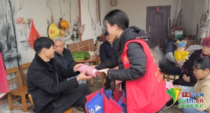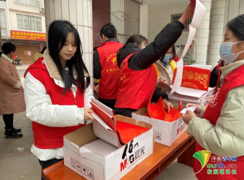 图为返家乡志愿给社区居民分发春联。中国青年网通讯员 邓嘉蕾 供图