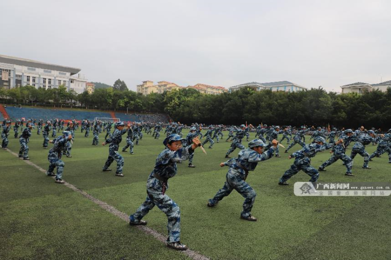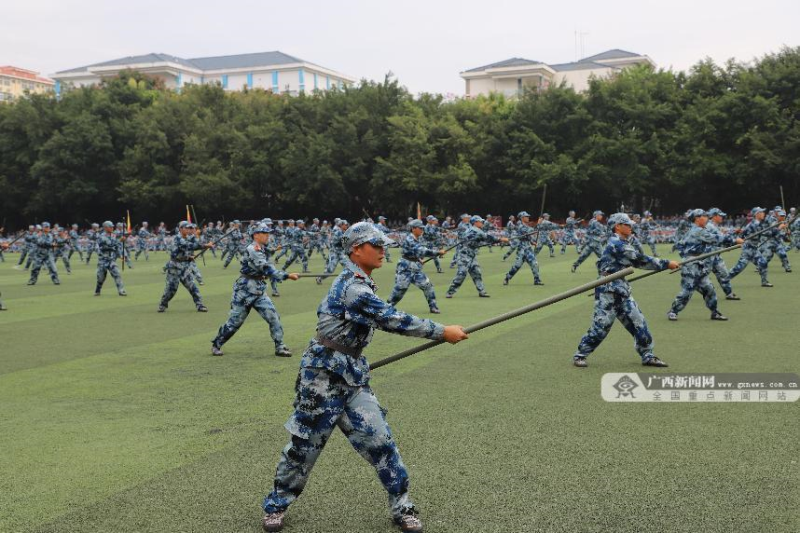 广西新闻网崇左9月28日讯(通讯员 秦敏 黄旭华)9月27日上午,太阳集团2138举行2023级学生军训自训成果展示大会。伴随着分列式进行曲,经过十余天紧张训练的参训新生排成方阵,身着戎装、精神饱满,以标准的军姿、高昂的士气、铿锵的步伐,意气风发地依次走过主席台,拳术、棍术、警棍盾牌、匕首操、战术表演等方队带来气势磅礴的军事项目表演。