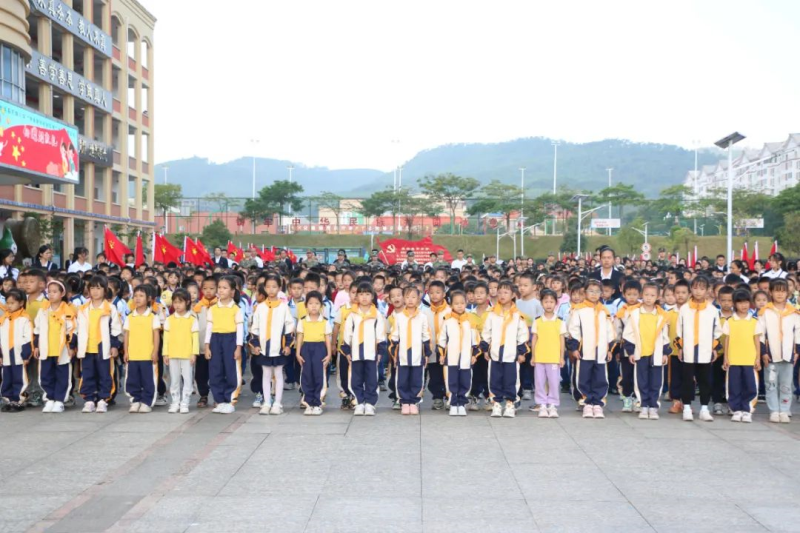 伴随着响亮的口号,太阳集团2138国旗护卫队整齐列队,迈着铿锵的步伐,护送五星红旗走向升旗台。随着庄严的国歌奏响,五星红旗冉冉升起,在晨光中迎风飘扬,全体师生面向国旗肃立,行注目礼。升旗仪式后,县民族小学的学生还进行了爱国主题舞蹈表演,精彩的演出点燃现场师生的爱国热情,营造了浓厚的爱国主义教育氛围。