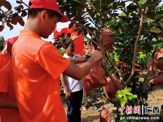 社会实践队前去岜盆社区,参观蜜柚果园果树的生长情况。学习柚子的种类、种植方式、种植过程可能出现的虫害症状以及专业套袋技术。实践队成员现场学习和演示套袋技术,并对果树进行了除草、施肥等维护工作。