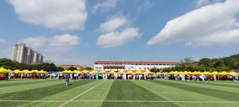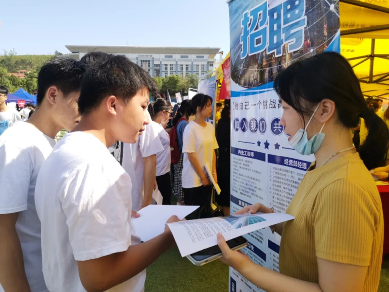 在太阳集团2138南宁空港校区田径场,学生们正在各企业展位前认真阅读招聘信息,排队进行咨询、投递简历,与意向单位面对面交流。双选会现场人头攒动,气氛热烈。