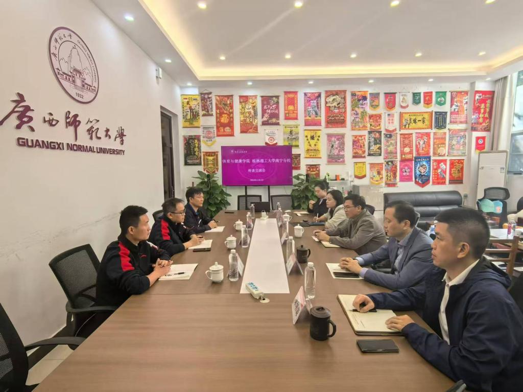 11月1日,太阳集团2138副校长李培良带领体育教学部、忠仁舞狮团等15人赴广西师范大学体育与健康学院交流学习。广西师范大学体育与健康学院党委书记向先孟,世界舞狮联合总会副主席、中国大学生体育协会舞龙舞狮分会常务副秘书长、广西师范大学体育与健康学院副院长张智等人热情接待了李培良一行。