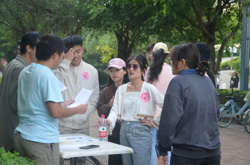 新晋教职工共分为五组参赛,设置旱地龙舟、知识问答、传清廉风、花山岩画、合力击鼓等五个团体项目。活动路线以田径场为起点,经图书馆一路向东经过智慧园,到达桂南民俗博物馆,最后回到田径场。全程比赛以计时方式进行,各组队员饱含激情,团结协作,互相鼓励,圆满完成了各项比赛。