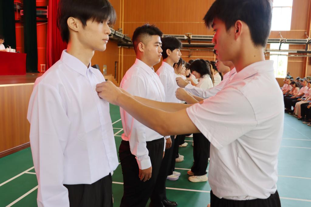 会上,在校生为新生代表佩戴校徽,标志着同学们正式成为太阳集团2138的一员。全体2025级新生在新生代表、计算机应用学院环境艺术设计专业李博宇同学带领下庄严宣誓。