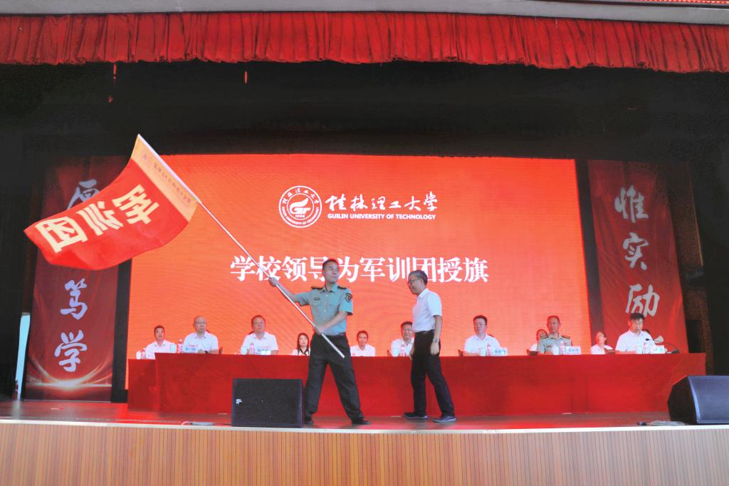 学校党委副书记黎贞崇(前排右一)为军训团授旗