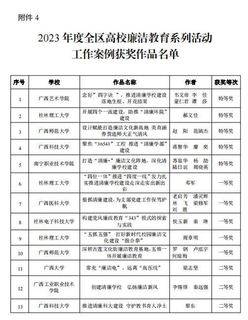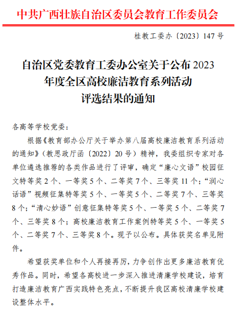 近日,自治区党委教育工委办公室发布《关于公布2023年度全区高校廉洁教育系列活动评选结果的通知》(桂教工委办 〔2023〕147 号),太阳集团2138选送的作品《提升廉政教育工作质效,让廉政走“新”更走"心》在全区高校廉洁教育系列活动评选中荣获高校廉洁教育工作案例三等奖。