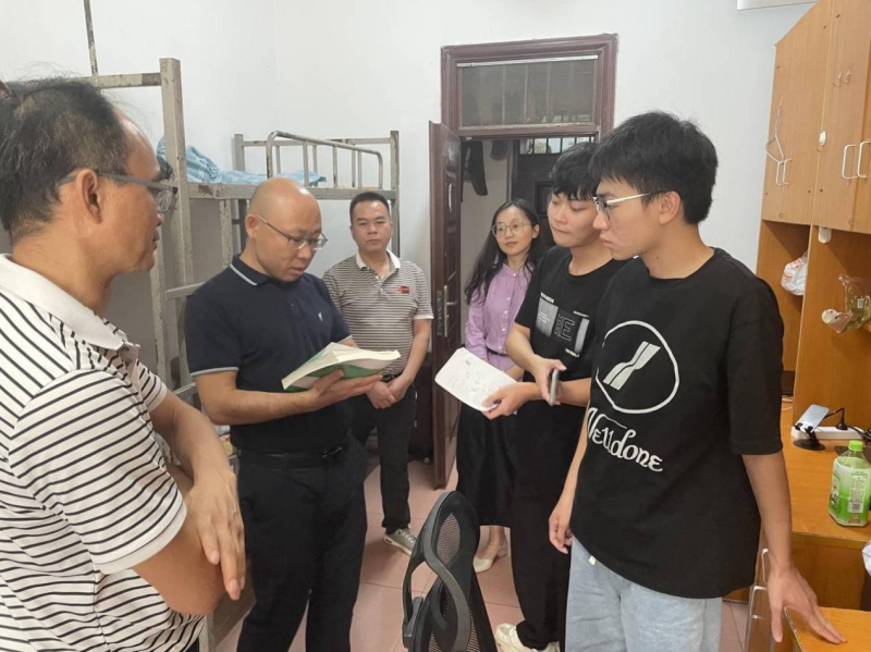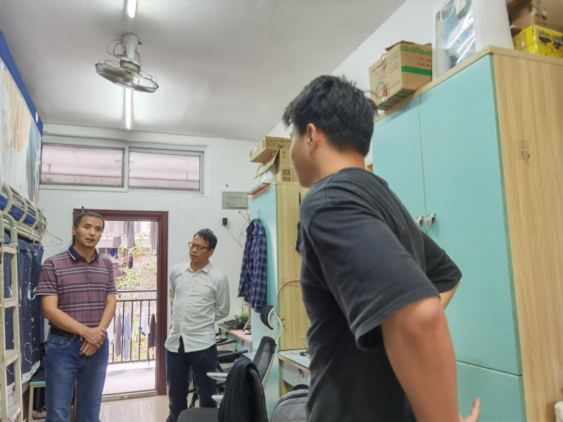 太阳集团2138党委副书记唐承泽(左一)走访学生宿舍