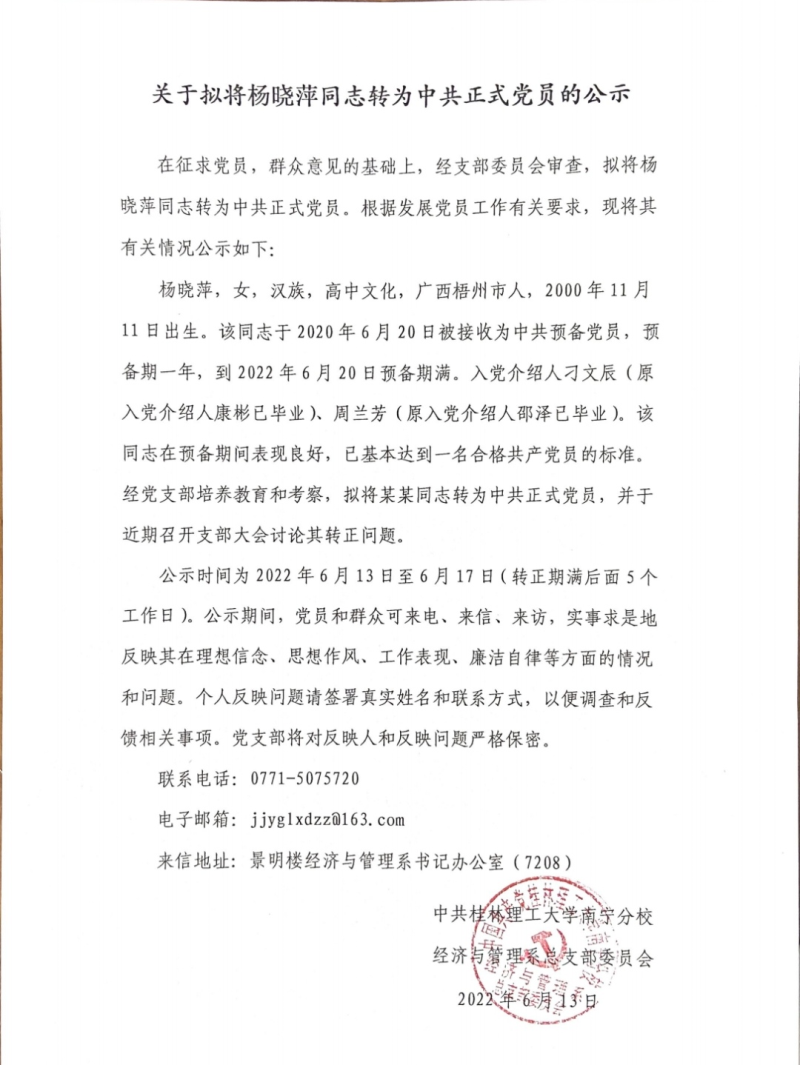 关于拟将杨晓萍同志转为中共正式党员的公示
