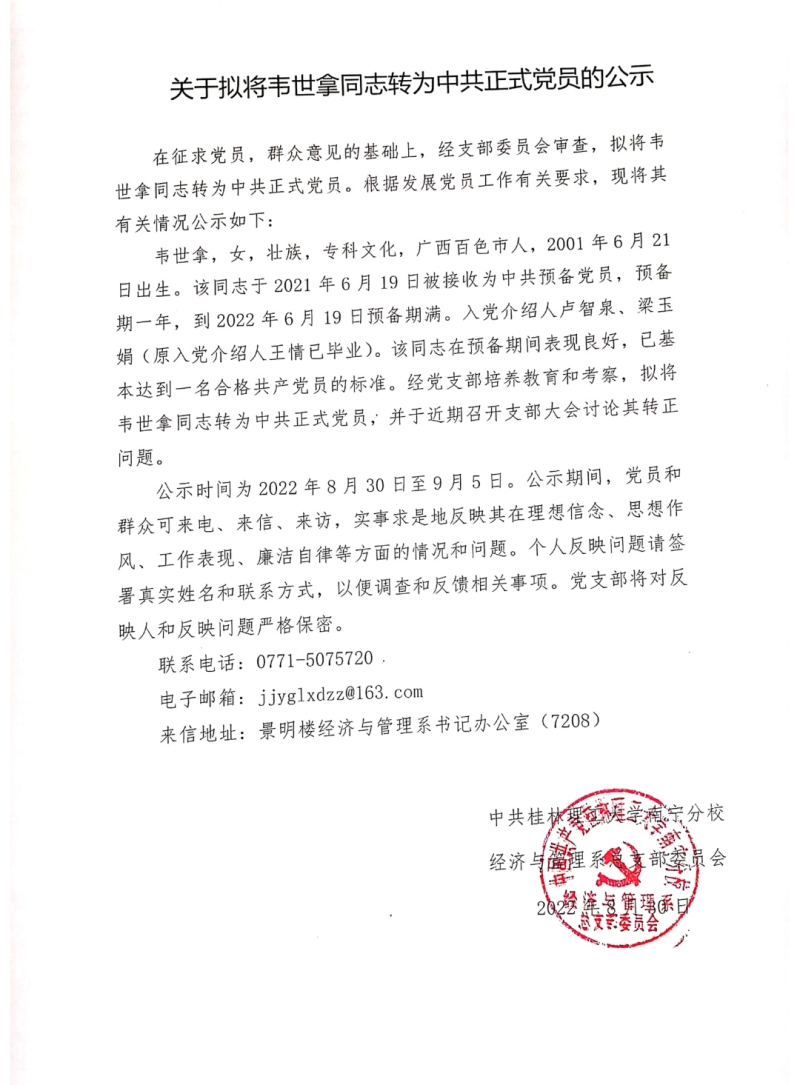 关于拟将韦世拿同志转为中共党员的公示