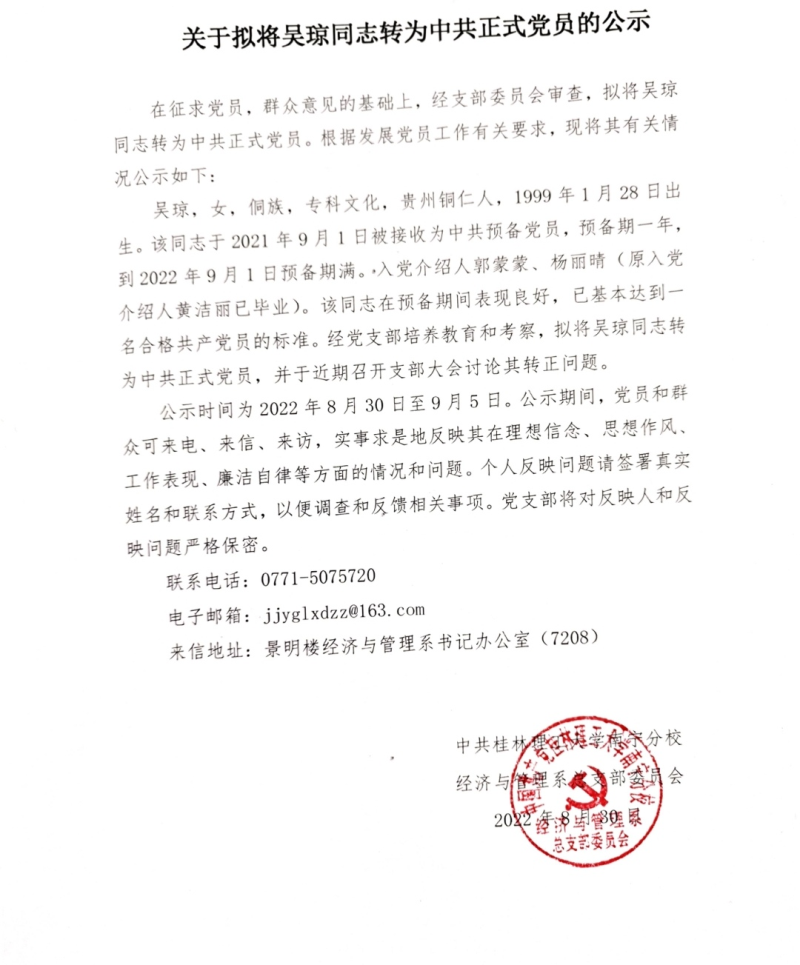 关于拟将吴琼同志转为中共党员的公示