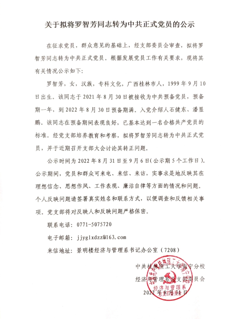 关于拟将罗智芳同志转为中共党员的公示