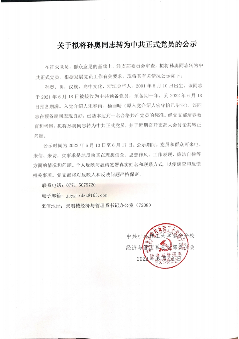 关于拟将孙奥同志转为中共正式党员的公示