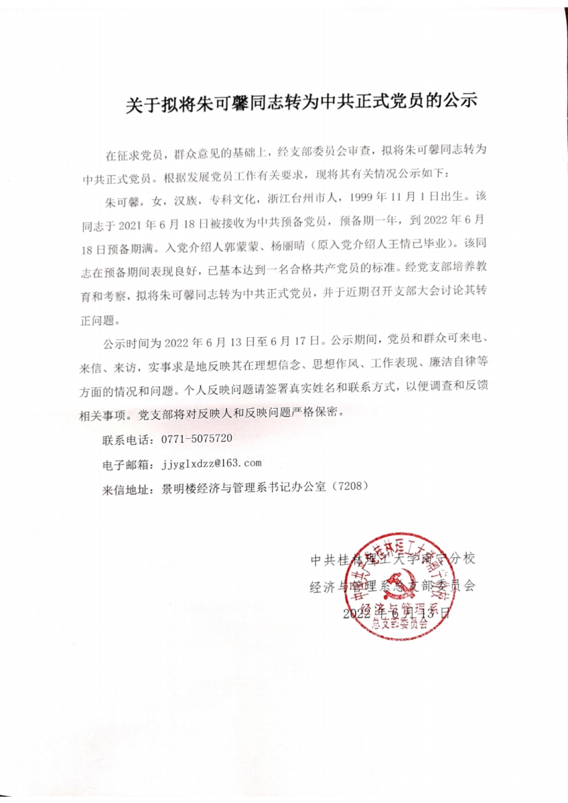 关于拟将朱可馨同志转为中共正式党员的公示