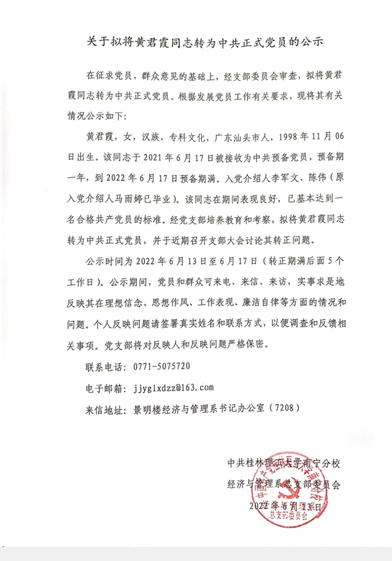 关于拟将黄君霞同志转为中共正式党员的公示