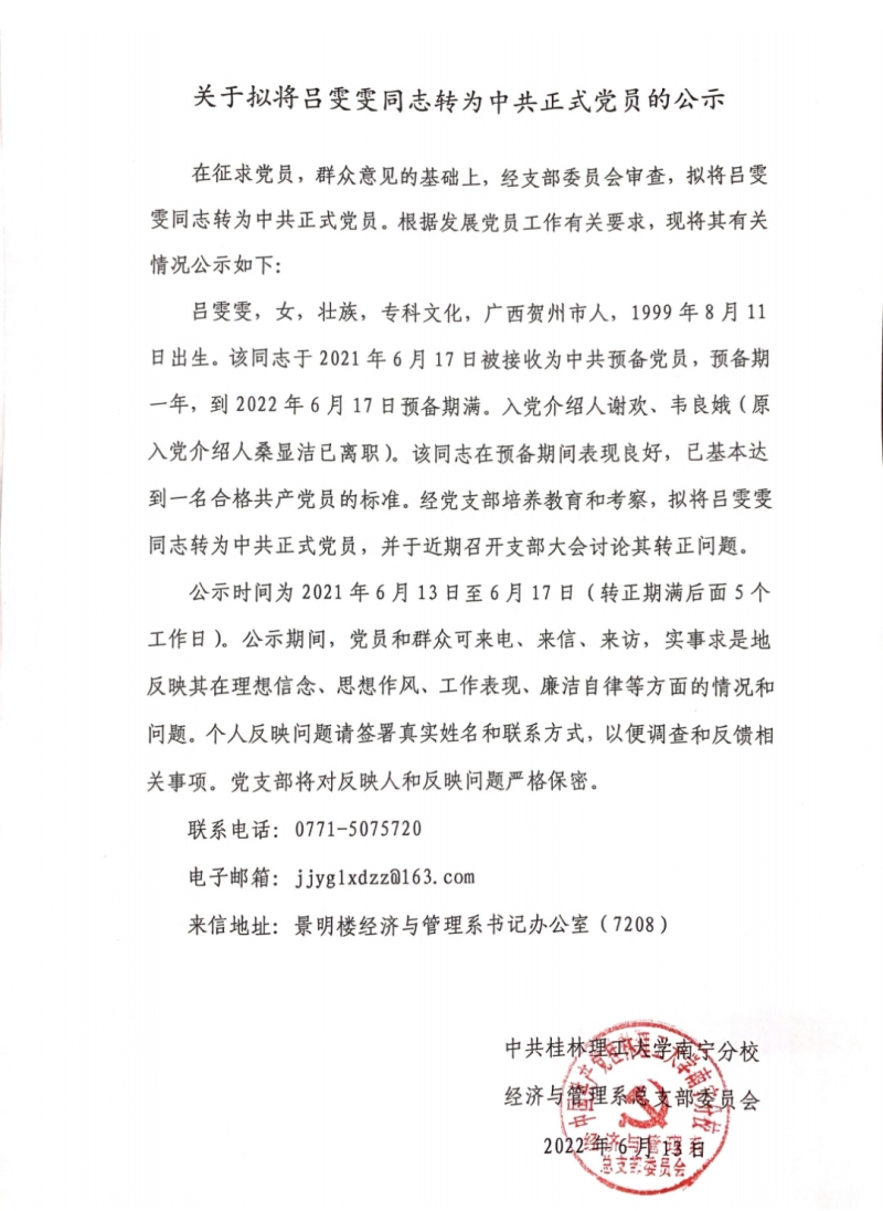 关于拟将吕雯雯同志转为中共正式党员的公示