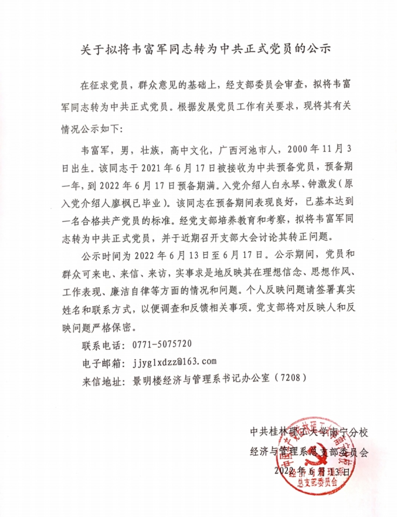 关于拟将韦富军同志转为中共正式党员的公示