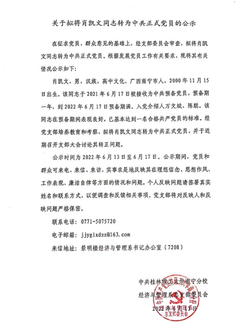 关于拟将肖凯文同志转为中共正式党员的公示