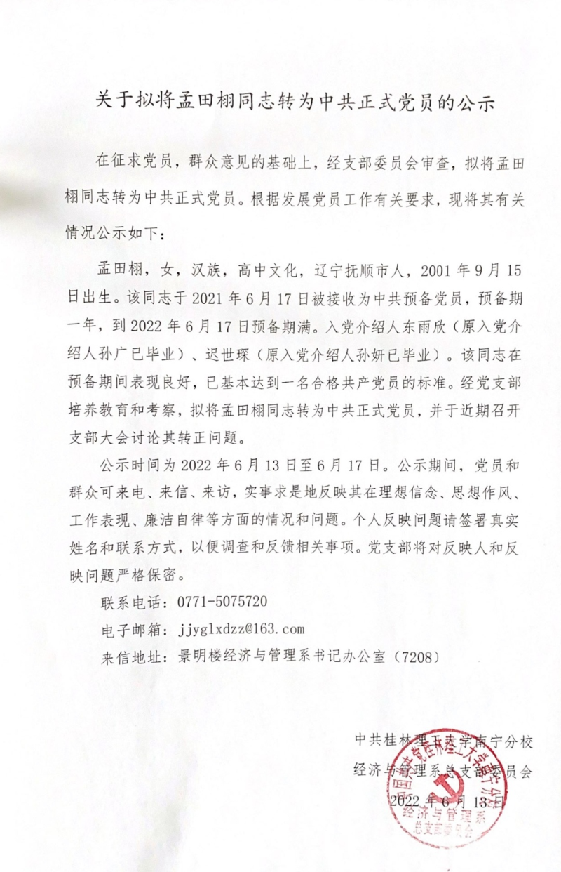 关于拟将孟田栩同志转为中共正式党员的公示